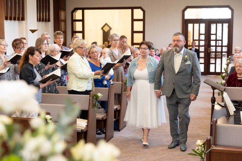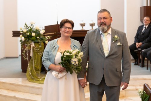 Dankbarkeit und Freude war auch in unseren Herzen, als dann nach der Feier des Heiligen Abendmahls unsere Geschwister Sandra und André Schultze am Altar den Segen Gottes zu dem von ihnen einige Tage zuvor geschlossenen Ehebund erhielten. Unser Vorsteher, Bischof Knispel, gab ihnen das Wort aus Hebräer 10, 24 an die Hand. Dort heißt es: Lasst uns aufeinander achthaben und einander anspornen zur Liebe und zu guten Werken.